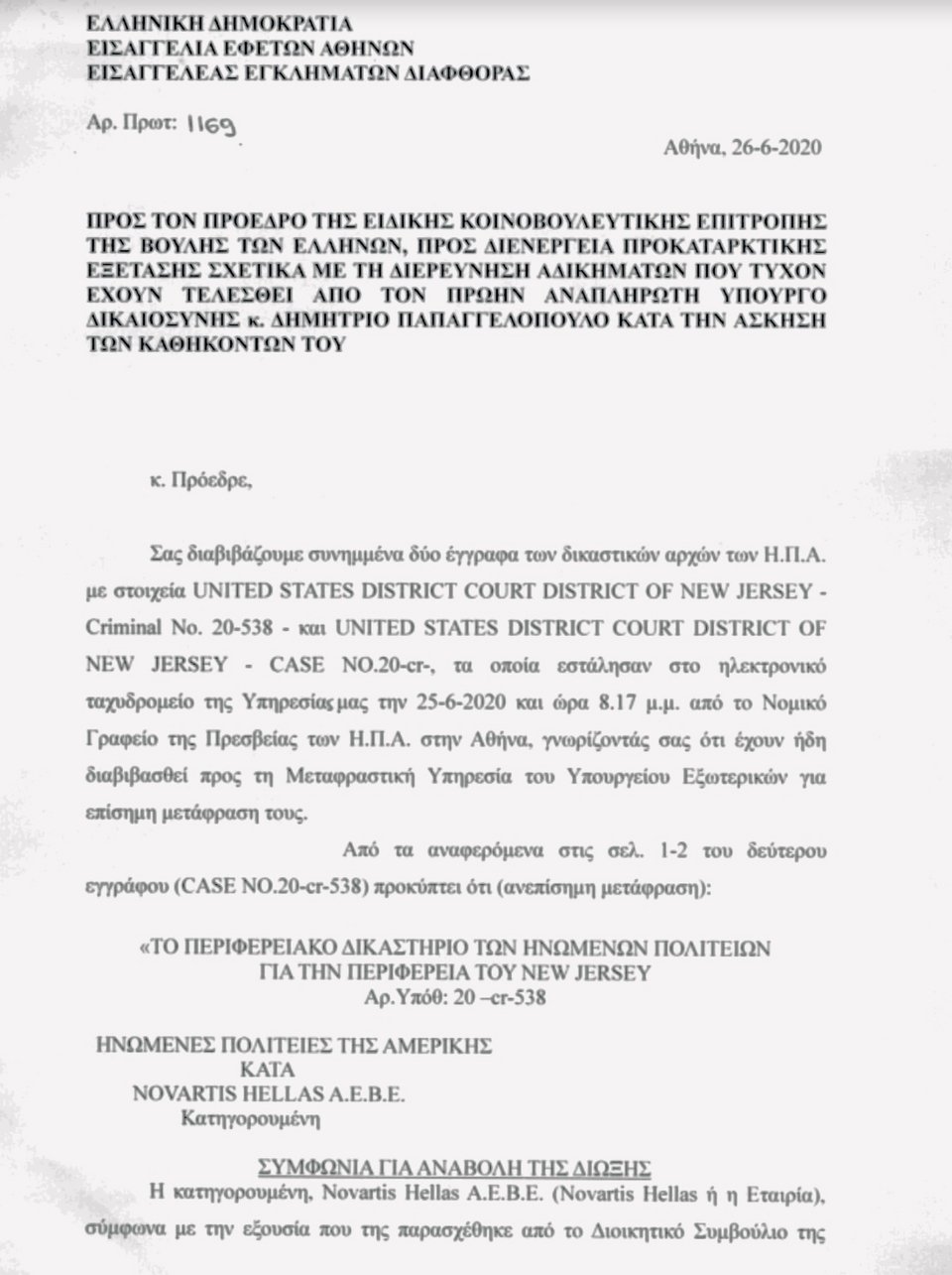 Στο διαβιβαστικό της Εισαγγελίας η κ. Τουλουπάκη μεταξύ άλλων αναφέρει «Σας διαβιβάζουμε συνημμένα δύο έγγραφα των δικαστικών αρχών των Η.Π.Α. με στοιχεία UNITED STATES DISTRICT COURT DISTRICT OF NEW JERSEY – Criminal No. 20-538 – και UNITED STATES DISTRICT COURT DISTRICT OF NEW JERSEY –CASE NO.20-cr-, τα οποία εστάλησαν στο ηλεκτρονικό ταχυδρομείο της Υπηρεσίας μας την 25-6-2020 και ώρα 8.17 μ.μ. από το Νομικό Γραφείο της Πρεσβείας των Η.Π.Α. στην Αθήνα, γνωρίζοντας σας ότι έχουν ήδη διαβιβασθεί προς τη Μεταφραστική Υπηρεσία του Υπουργείου Εξωτερικών για επίσημη μετάφραση τους»