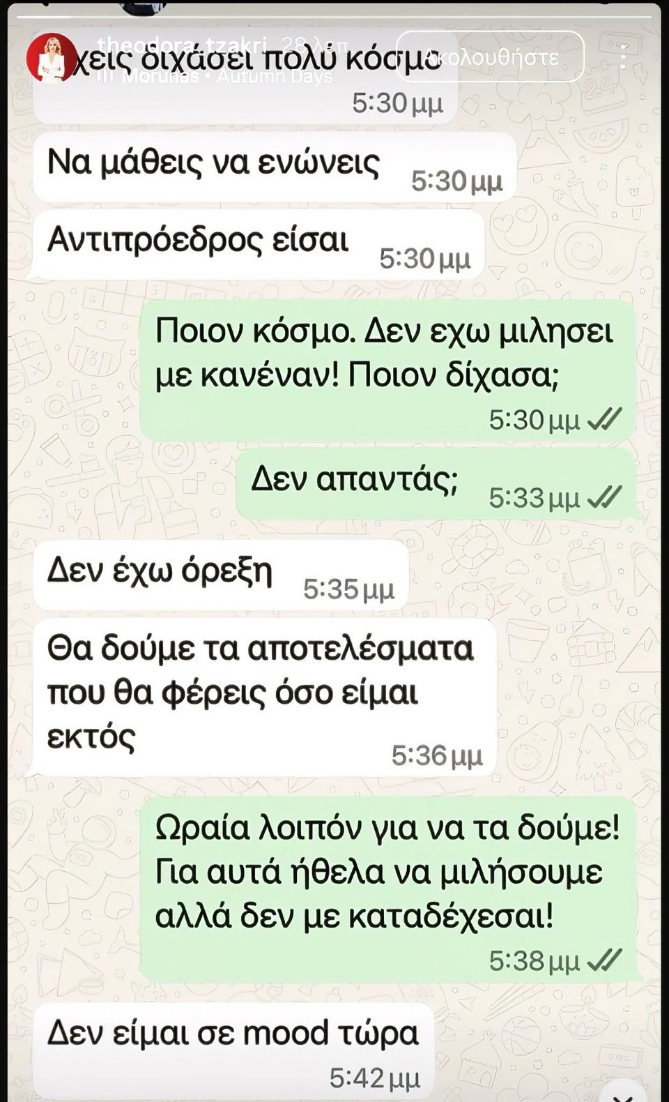 Όπως σχολιάζει ο στιχουργός στην ανάρτησή του «Ο Πρόεδρος διακοπές στην Αμερική, η Αντιπρόεδρος τον ψάχνει, εκείνος δεν είναι σε mood να της μιλήσει, εκείνη κάνει print screen τη συνομιλία τους κι αντί να τη στείλει εκεί που θέλει (ποιος ξέρει πού;) την ανεβάζει καταλάθος στόρι στο ίνσταγκραμ σε δημόσια θέα». Η ανάρτηση συνοδεύεται από τις σχετικές φωτό από την ανάρτηση του διαλόγου στον λογαριασμό της Θ. Τζάκρη, που αναδημοσιεύει ο Νίκος Μωραΐτης από άλλο tweet.