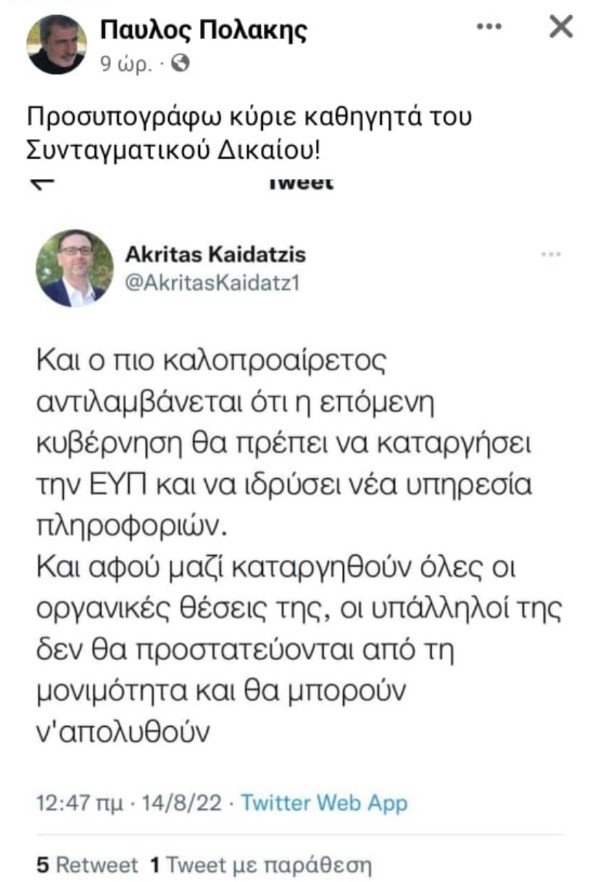 Ο επίκουρος καθηγητής Συνταγματικού Δικαίου στο ΑΠΘ και πρώην Γενικός Γραμματέας της κυβέρνησης ΣΥΡΙΖΑ κ. Καϊδατζής έγραψε στον προσωπικό του λογαριασμό στο Twitter ότι η ΕΥΠ πρέπει να καταργηθεί και να απολυθούν όλοι οι σημερινοί της υπάλληλοι.