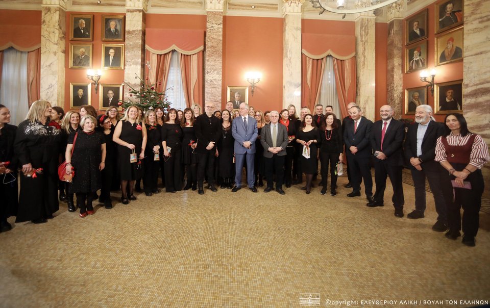 Ακούσαμε εδώ κάλαντα, ευχές, αλλά ακούσαμε και την ελπίδα για το νέο χρόνο. Και περισσότερο από καθετί, αυτή την ελπίδα για καλύτερη χρονιά το 2025 την συμβόλισε ο πεντοζάλης από τον Σύλλογο των Βρακοφόρων Κρήτης που συμπλήρωσε μισό αιώνα ζωής, αυτός ο άξιος πολιτιστικός Σύλλογος από το Ρέθυμνο. Ο πεντοζάλης είναι ένας δυναμικός χορός που χορεύεται με μεγάλη ταχύτητα, με ορμή αλλά έχει και κάτι το οποίο κατά την γνώμη μου είναι πάρα πολύ συμβολικό και ταιριάζει με το πως βρισκόμαστε σήμερα ως χώρα. Ο πρωτοχορευτής κάποια στιγμή λυγίζει τα γόνατα και τινάζεται στον αέρα, τινάζεται ψηλά και οι υπόλοιποι τον κρατάνε γερά για να ξαναπροσγειωθεί. Έτσι και η χώρα μας αυτή τη περίοδο, έχοντας σημειώσει πρόοδο ετοιμάζεται για το μεγάλο άλμα. Για ένα άλμα το οποίο μας δίνει ελπίδα, μας δίνει κουράγιο και μας κάνει όλους να αισθανόμαστε πως αυτό το άλμα πρέπει να το βοηθήσουμε όλοι κρατώντας γερά τον πρωτοχορευτή, κρατώντας γερά την ελπίδα δηλαδή, να πραγματοποιηθεί. Αυτός ο συμβολισμός της ελπίδας, της αγάπης και της αλληλεγγύης, σε μια Ελλάδα που ετοιμάζεται να ταιριάξει με κάθε άλλη προηγμένη ευρωπαϊκή χώρα είναι που μας κάνει να αισθανόμαστε υπερήφανοι, μας κάνει να αισθανόμαστε πως αξίζουμε αυτό που διεκδικούμε και που αφού το κατακτήσουμε και μέρα μέρα το κατακτούμε είμαστε έτοιμοι και να το προφυλάξουμε. Εύχομαι σε όλες και όλους εδώ από το Μέγαρο του Εθνικού Κοινοβουλίου, το Μέγαρο της Εθνικής Αντιπροσωπείας, καλές γιορτές, καλά Χριστούγεννα και κάθε καλό για τη νέα χρονιά!»