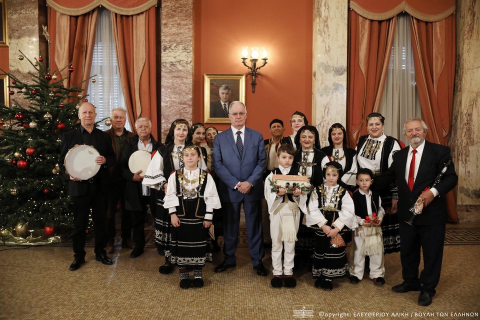 Ο Πρόεδρος της Βουλής των Ελλήνων, κ. Κωνσταντίνος Τασούλας, υποδέχθηκε στον χώρο του Εντευκτηρίου παιδιά από το Νηπιαγωγείο της Βουλής, τον Όμιλο Βρακοφόρων Κρήτης, το Κέντρο Ειδικών Ατόμων η «Χαρά», τη Χορωδία του Συλλόγου των Υπαλλήλων της Βουλής, το Λύκειο των Ελληνίδων και τον Πολιτιστικό Σύλλογο Ηπειρωτών Βριλησσίων «Ο Πύρρος», που τραγούδησαν παραδοσιακά κάλαντα από την Κρήτη, την Ήπειρο, την Θράκη και τα ελληνικά νησιά.