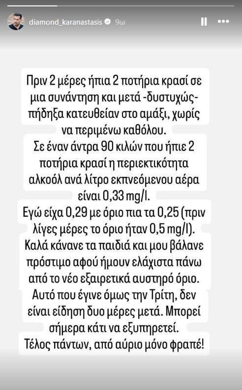 Στον κ. Καραναστάση επιβλήθηκε πρόστιμο 350 ευρώ και αφαιρέθηκε το δίπλωμα οδήγησης για έναν μήνα, σύμφωνα με τον νόμο. Ο ίδιος σχολίασε το περιστατικό σε story που ανήρτησε στο Instagram.