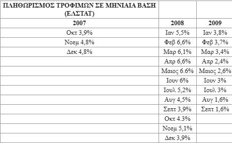 Στη συνέχεια ο «γαλάζιος» βουλευτής επισυνάπτει πίνακα με τον πληθωρισμό τροφίμων σε μηναία βάση από τον Οκτώβριο 2007 έως τον Σεπτέμβριο 2009 (ΕΛΣΤΑΤ). Όπως εξηγεί «αυτό που προκύπτει από την εξέλιξη των μεγεθών είναι ότι ήταν μια δύσκολη μάχη αλλά με την εφαρμογή των μέτρων αγορανομικού χαρακτήρα (transfer pricing, έλεγχοι υπερβολικής κερδοφορίας, κλπ) πάντα στο πλαίσιο της ευρωπαϊκής νομοθεσίας καταφέραμε να μειώσουμε σταδιακά το ρυθμό αύξησης του πληθωρισμού τροφίμων από τον Δεκ. 2008 σταθερά σε μεγέθη κάτω του 4% και τον παραδώσαμε τον Σεπτέμβριο 2009 σε ποσοστό 1,6%».