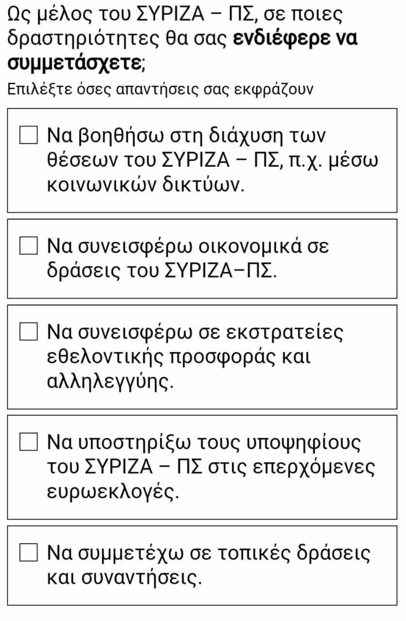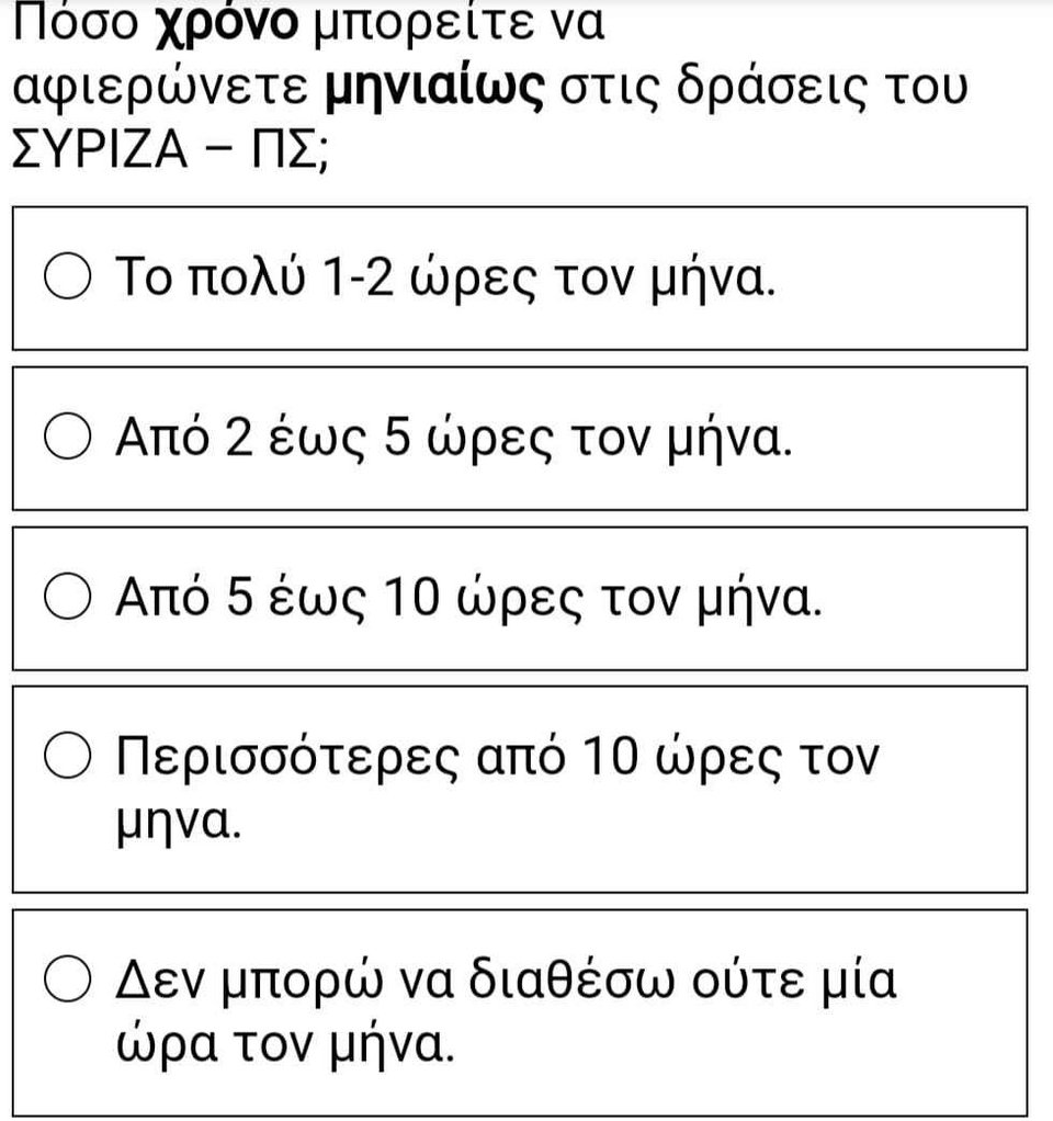 - Πόσο χρόνο μπορείτε να αφιερώνετε μηνιαίως στις δράσεις του ΣΥΡΙΖΑ – ΠΣ;