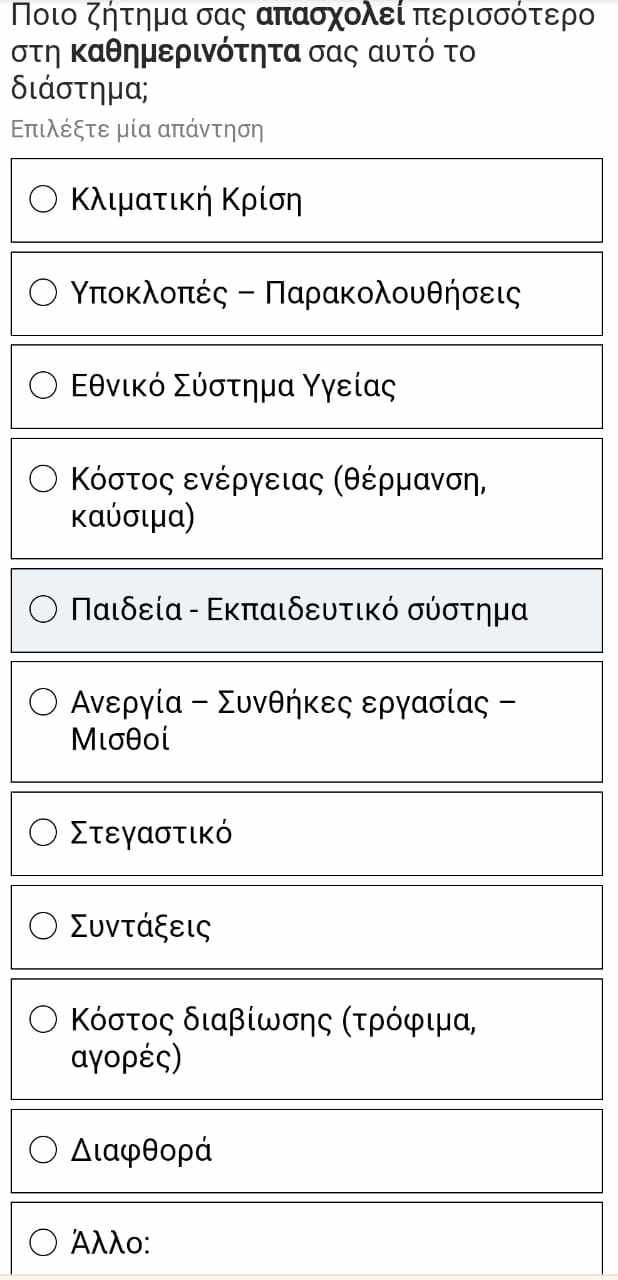 Ποιο ζήτημα σας απασχολεί περισσότερο στην καθημερινότητά σας αυτό το διάστημα;