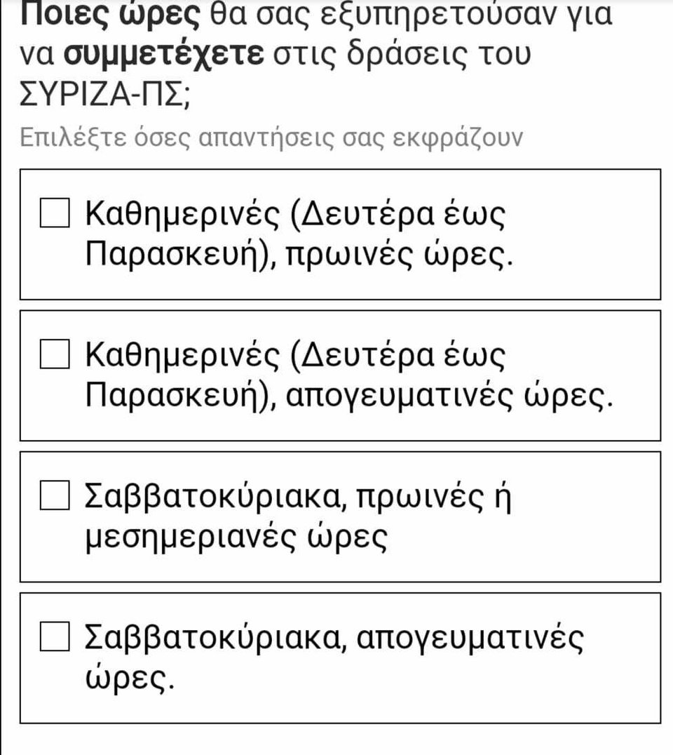 - Ποιες ώρες θα σας εξυπηρετούσαν για να συμμετέχετε στις δράσεις του ΣΥΡΙΖΑ-ΠΣ;