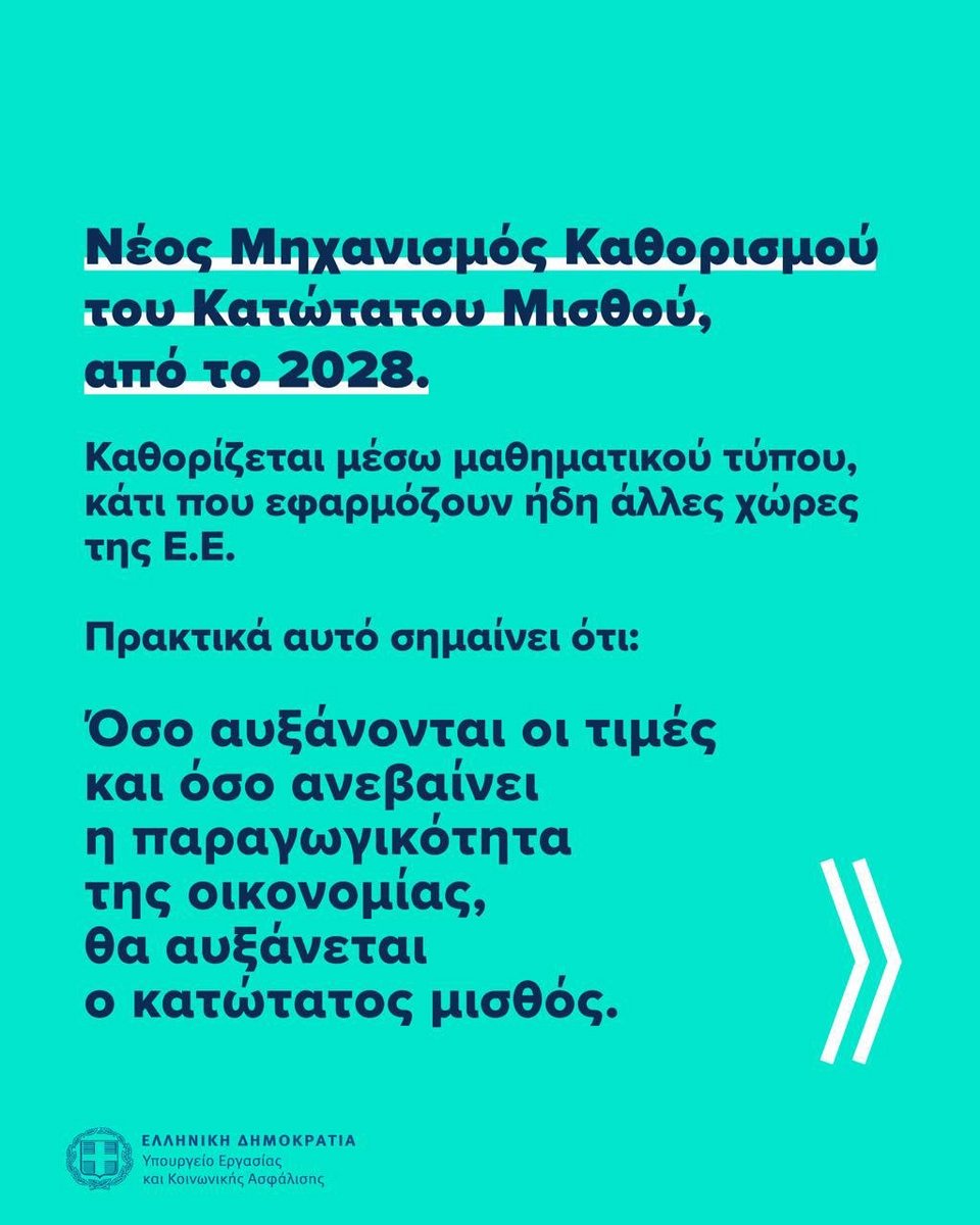 Από το 2028, ο κατώτατος μισθός προτείνεται να καθορίζεται μέσω ενός μαθηματικού τύπου ο οποίος θα λαμβάνει υπόψη του τον πληθωρισμό, ιδιαίτερα για τα νοικοκυριά στο χαμηλότερο 20% της εισοδηματικής κλίμακας, καθώς και την αύξηση της παραγωγικότητας της οικονομίας, με βάση αντικειμενικούς δείκτες που θα δημιουργήσει η Ελληνική Στατιστική Αρχή (ΕΛΣΤΑΤ).