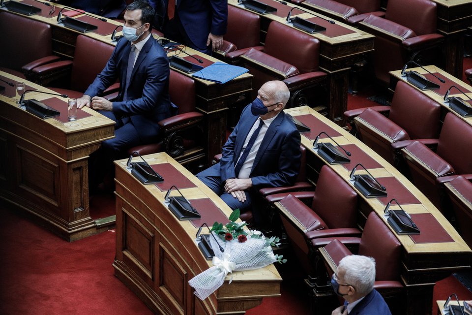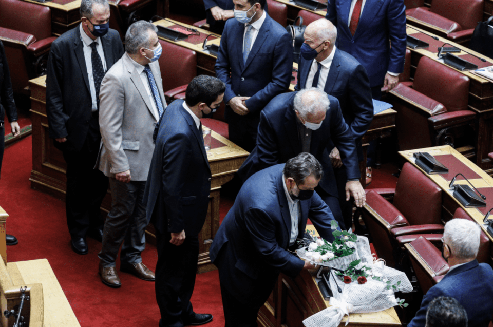 Mε μια αγκαλιά λουλούδια, το κεφάλι σκυμμένο, σιωπηλός ο πρόεδρος της Βουλής Κώστας Τασούλας, πλησίασε στα έδρανα όπου μέχρι πριν λίγες ημέρες καθόταν η Φώφη Γεννηματά. Τηρήθηκε ενός λεπτού σιγή.