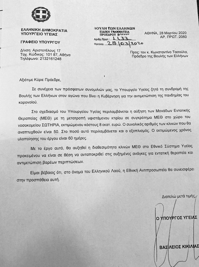 Η επιστολή του υπουργού Υγείας εστάλη προς τον Πρόεδρο της Βουλής, Κώστα Τασούλα και σε αυτήν ο κ. Κικίλιας εξέφραζε τη βεβαιότητά του ότι η εθνική αντιπροσωπεία θα συνεισφέρει στην προσπάθεια της πολιτείας για καταπολέμηση της πανδημίας του κορωνοϊού