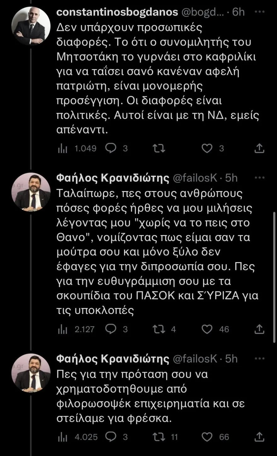 «Ταλαίπωρε, πες στους ανθρώπους πόσες φορές ήρθες να μου μιλήσεις λέγοντάς μου "χωρίς να το πεις στο Θάνο", νομίζοντας πως είμαι σαν τα μούτρα σου και μόνο ξύλο δεν έφαγες για την διπροσωπία σου. Πες για την ευθυγράμμισή σου με τα σκουπίδια του ΠΑΣΟΚ και ΣΥΡΙΖΑ για τις υποκλοπές» και πρόσθεσε «πες για την πρότασή σου να χρηματοδοτηθούμε από φιλορωσοψέκ επιχειρηματία και σε στείλαμε για φρέσκα».
