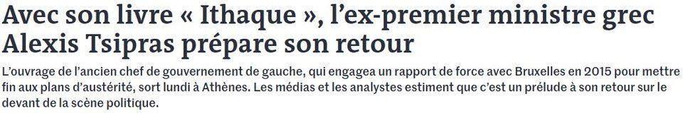 «Ήρθε η ώρα να πω την αλήθεια μου». Με αυτή τη φράση του Αλέξη Τσίπρα ξεκινά το κείμενό της η ανταποκρίτρια της Le Monde στην Αθήνα, Μαρίνα Ράφενμπεργκ. Δέκα χρόνια μετά την ελληνική κρίση που συγκλόνισε την Ευρώπη, ο «ανακατωσούρας της αριστεράς» - χρησιμοποιεί τη λέξη «trublion» δηλαδή κάποιον που δημιουργεί προβλήματα και αναστάτωση -, που έγινε ο νεότερος πρωθυπουργός της Ελλάδας στα 40 του έτη, επανεξετάζει αυτό το ακόμη τραυματικό επεισόδιο για την ελληνική κοινωνία στην «Ιθάκη», ένα βιβλίο 730 σελίδων, σημειώνει η ίδια.