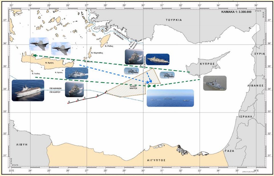 Ελληνικά και γαλλικά πολεμικά πλοία, μαχητικά και ελικόπτερα σάρωσαν την Πέμπτη τη θαλάσσια περιοχή από την Κύπρο έως το ανατολικό άκρο της Κρήτης, τμήμα στο οποίο περιλαμβάνεται και η παράνομη τουρκική NAVTEX.