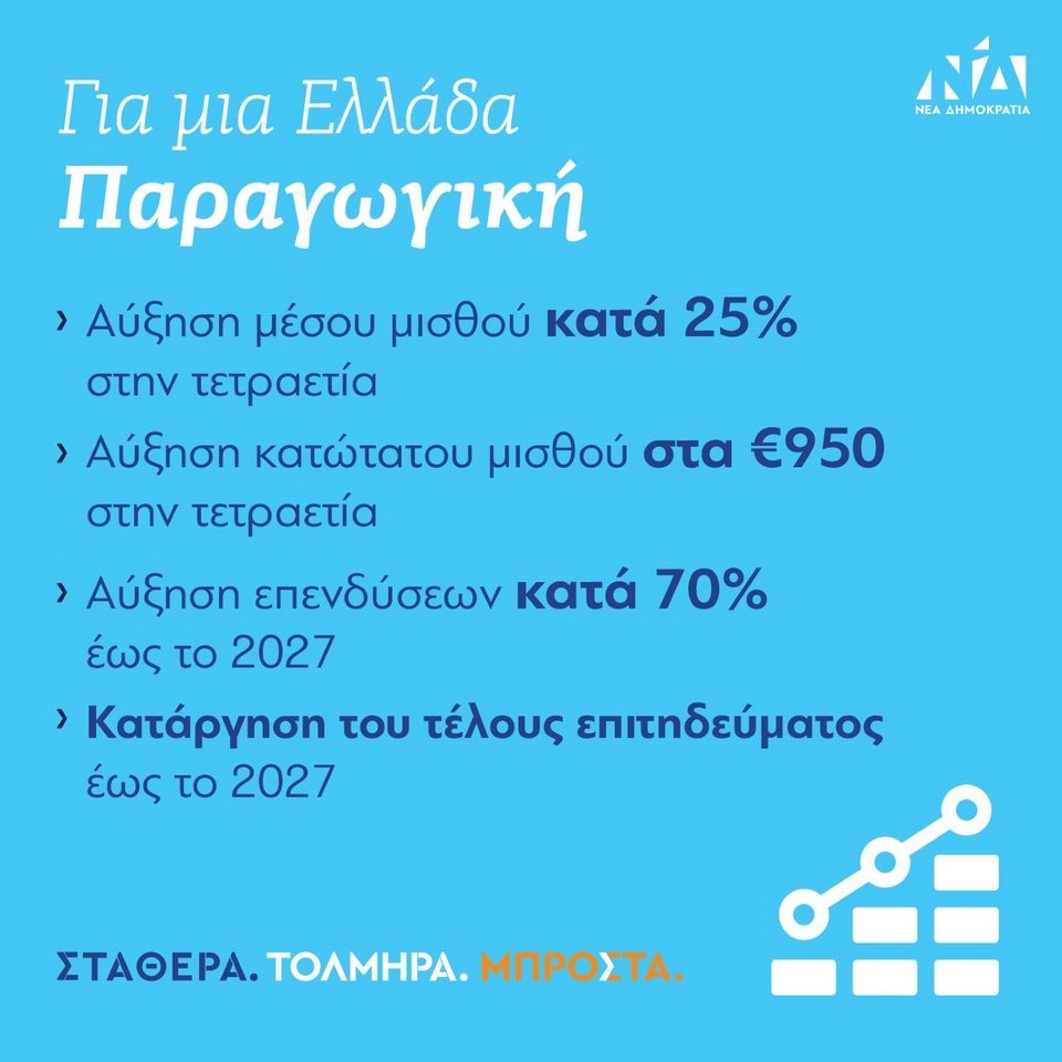 Ο Κ. Μητσοτάκης ξεκαθάρισε ότι ο στόχος της ΝΔ είναι να φτάσει ο κατώτατος μισθός τουλάχιστον τα 950 ευρώ στο τέλος της τετραετίας.