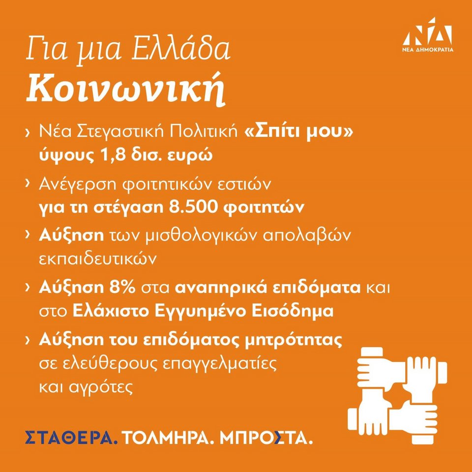 Περνώντας στον άξονα της Κοινωνικής Ελλάδας, ο Κυριάκος Μητσοτάκης μίλησε για πολιτικές που έχουν να κάνουν με την Παιδεία, με την Υγεία, με την Κοινωνική Συνοχή.
