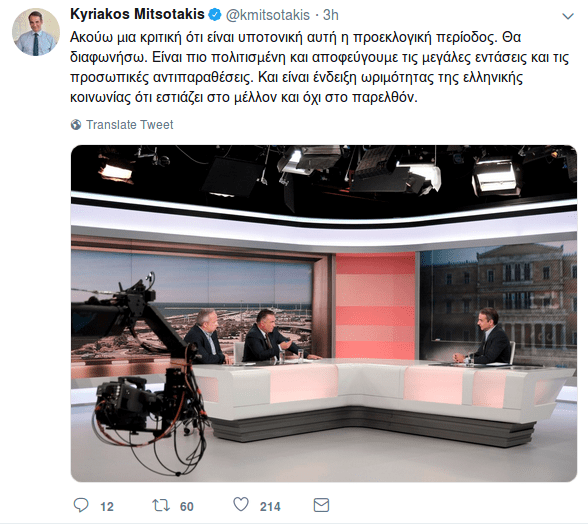 Την ίδια ώρα ο Κυριάκος Μητσοτάκης χαρακτήρισε καλοδεχούμενη την απόφαση του πρωθυπουργού να εμφανιστεί στον ΣΚΑΙ και είπε ότι μάλλον η κίνησή του δείχνει πανικό. Παράλληλα υπενθύμισε ότι το κόμμα του πριν μερικούς μήνες μήνες έσπασε το εμπάργκο που είχε επιβάλλει στην ΕΡΤ και πρόσθεσε ότι είναι θετικό να μην υπάρχει κανένα εμπάργκο. Είπε ακόμα ότι δεν υπάρχει χρόνος για debate αλλά όχι με δική του υπαιτιότητα.