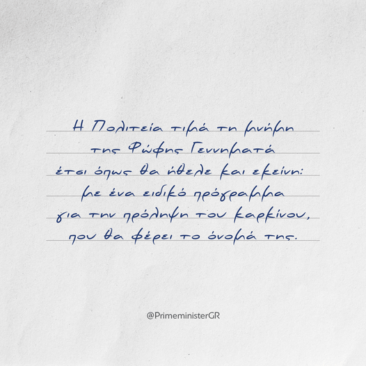«Η Πολιτεία τιμά τη μνήμη της Φώφης Γεννηματά έτσι όπως θα ήθελε και εκείνη: με ένα ειδικό πρόγραμμα για την πρόληψη του καρκίνου, που θα φέρει το όνομά της. Ξεκινάμε όπως έχουμε δεσμευθεί από τον προσυμπτωματικό έλεγχο για τον καρκίνο του μαστού, διότι αποτελεί τη συχνότερη μορφή καρκίνου που απειλεί τις γυναίκες και ταυτόχρονα αυτόν που μπορεί να θεραπευθεί, εφόσον εντοπιστεί εγκαίρως.
