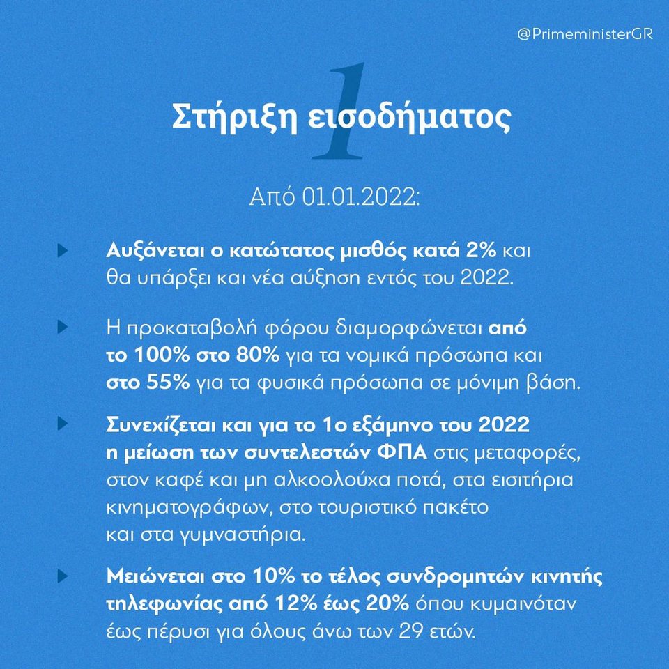 «Συνεπείς στις δεσμεύσεις μας, από την 1η Ιανουαρίου ισχύει μία ακόμη δέσμη μέτρων που μειώνουν τους φόρους και ενισχύουν το εισόδημα. Στόχος, να δημιουργηθούν νέες καλύτερες θέσεις εργασίας. Οι επιχειρήσεις να γίνουν πιο παραγωγικές. Να αυξηθούν τα δημόσια έσοδα, ώστε να στηρίξουμε τη δημόσια παιδεία και υγεία. Η αναδιανομή υπέρ των αδυνάμων να γίνει ακόμη πιο γενναία. Και ειδικά οι νέοι μας να έχουν μια καλύτερη ζωή. Το είπαμε, το κάνουμε και το 2022!»