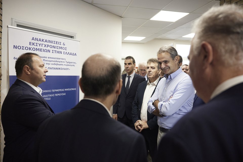 Ο Πρωθυπουργός Κυριάκος Μητσοτάκης επισκέφθηκε το Γενικό Νοσοκομείο Θεσσαλονίκης «Γεώργιος Παπανικολάου» και είδε από κοντά την πλήρως ανακαινισμένη Πνευμονολογική Κλινική του Εθνικού Συστήματος Υγείας που είχε υποστεί ζημιά από πυρκαγιά που ξέσπασε σε θάλαμο, τον Απρίλιο του 2022.