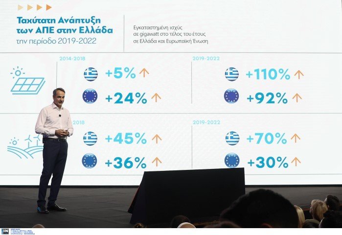 Ακολούθως ανέπτυξε τη σημασία της αιολικής ενέργειας υπογραμμίζοντας ότι «η χώρα μας παράγει σχεδόν το 50% της ενέργειάς της από τον ήλιο και τον άνεμο, τονίζοντας ότι «είμαστε πρωταγωνιστές στον κόσμο στην παραγωγή ενέργειας από ΑΠΕ».
