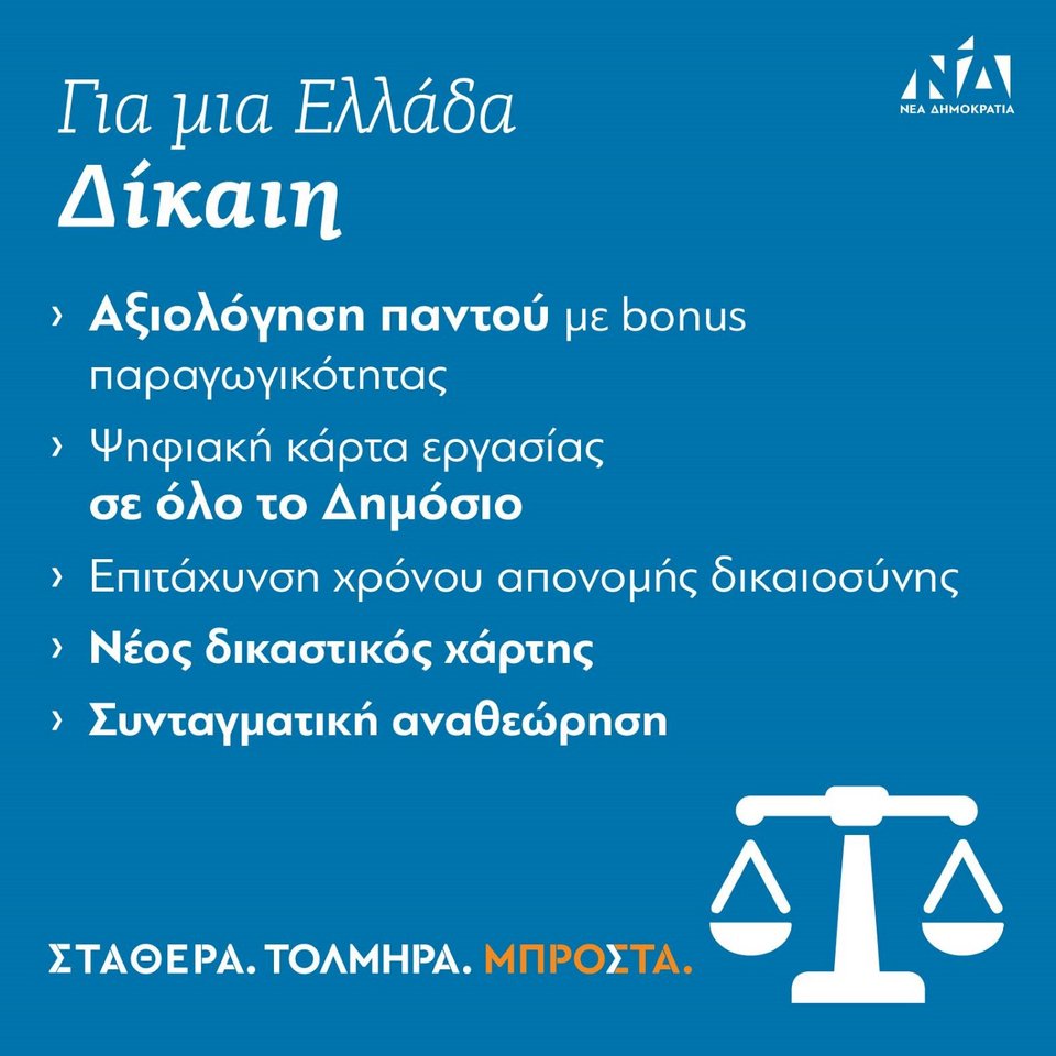 Ο επόμενος άξονας «Δίκαιη Ελλάδα» δεν περιλαμβάνει μόνο τον τομέα της Δικαιοσύνης, αλλά «σημαίνει μία Ελλάδα η οποία δεν αφήνει κανέναν πίσω και δίνει ίσες ευκαιρίες κυρίως σε εκείνους που χρειάζονται την κρατική φροντίδα περισσότερο από άλλους», τόνισε ο Κυριάκος Μητσοτάκης.