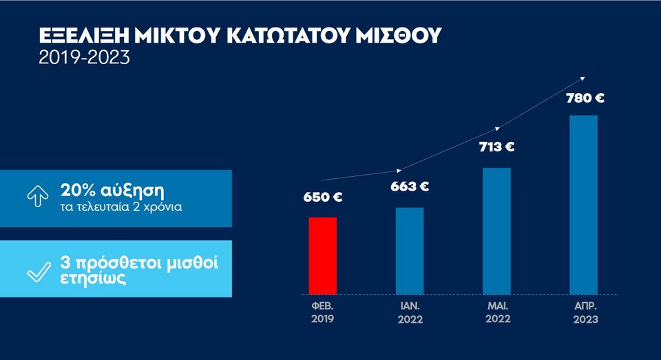 «Θα έχουμε αύξηση των μισθών για πρώτη φορά μετά από χρόνια των δημοσίων υπαλλήλων, μέσω νέου ενιαίου μισθολογίου την 1/1/2024 με συνολική επιβάρυνση 500 εκατομμύρια ευρώ πρόσθετα, μόνο για τις απολαβές των δημοσίων υπαλλήλων και εφαρμογή της ψηφιακής κάρτας εργασίας για όλες τις επιχειρήσεις ανεξαρτήτως μεγέθους και εντατικοί έλεγχοι της επιθεώρησης εργασίας.
