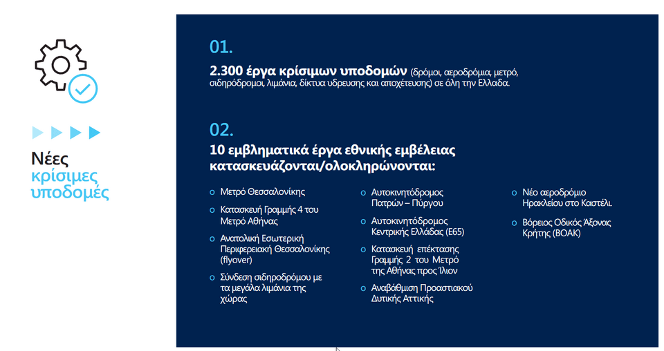 Ο κ. Μητσοτάκης στάθηκε στα έργα υποδομής, τονίζοντας πως το 2019 όραμά του ήταν η Ελλάδα να γίνει ένα απέραντο εργοτάξιο και πρόσθεσε πως το 2019-2023 δημοπρατήθηκαν 14 δισ. ευρώ έργα.
