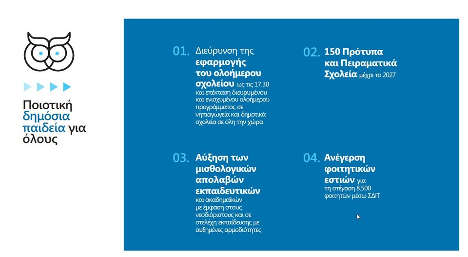 «Χτίζουμε πάνω στις 25.000 νέες προσλήψεις εκπαιδευτικών που έκανε αυτή η κυβέρνηση. Εκτιμούμε 4.000 με 5.000 νέες προσλήψεις εκπαιδευτικών κάθε χρόνο» είπε αναφερόμενος στο σχέδιο για την Παιδεία, ενώ υπογράμμισε πως «η επόμενη τετραετία θα είναι η τετραετία της εξωστρέφειας για τα δημόσια πανεπιστήμια».