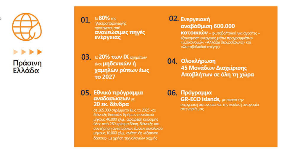 Συνόψισε και μια σειρά από προγράμματα όπως εκείνα της ενεργειακής αναβάθμισης 600.000 κατοικιών, την ολοκλήρωση 45 μονάδων διαχείρισης αποβλήτων σε όλη τη χώρα αλλά και το Εθνικό Πρόγραμμα Αναδασώσεων.