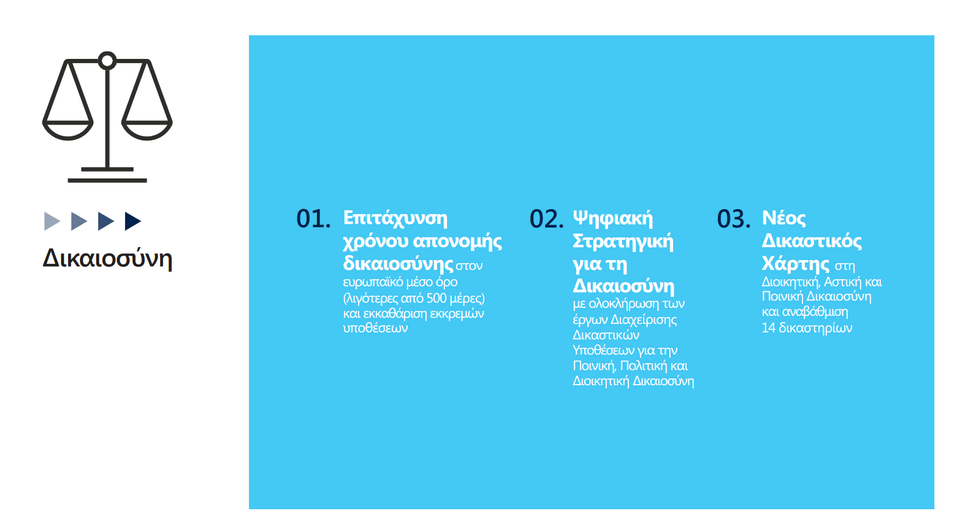 Επεσήμανε, όμως, ότι η Δικαιοσύνη αυτή καθαυτή είναι από τα μεγαλύτερα προβλήματα που αντιμετωπίζουμε εξαιτίας καθυστερήσεων και στόχος είναι εντός της τετραετίας να φθάσουμε στον ευρωπαϊκό μέσο όρο δηλαδή λιγότερες από 500 ημέρες για την εκκαθάριση των εκκρεμών υποθέσεων στη Δικαιοσύνη. Κι εδώ ρόλο θα παίξει η ψηφιακή δικαιοσύνη και ο νέος δικαστικός χάρτης.