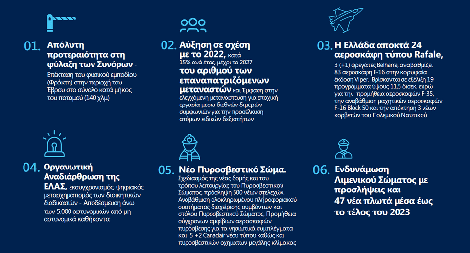 Μίλησε όμως και για τα κέντρα υποδοχής μεταναστών που έχουν μειωθεί από 122 το 2019 σε 31 και τις προσλήψεις 2.000 συνοριοφυλάκων.