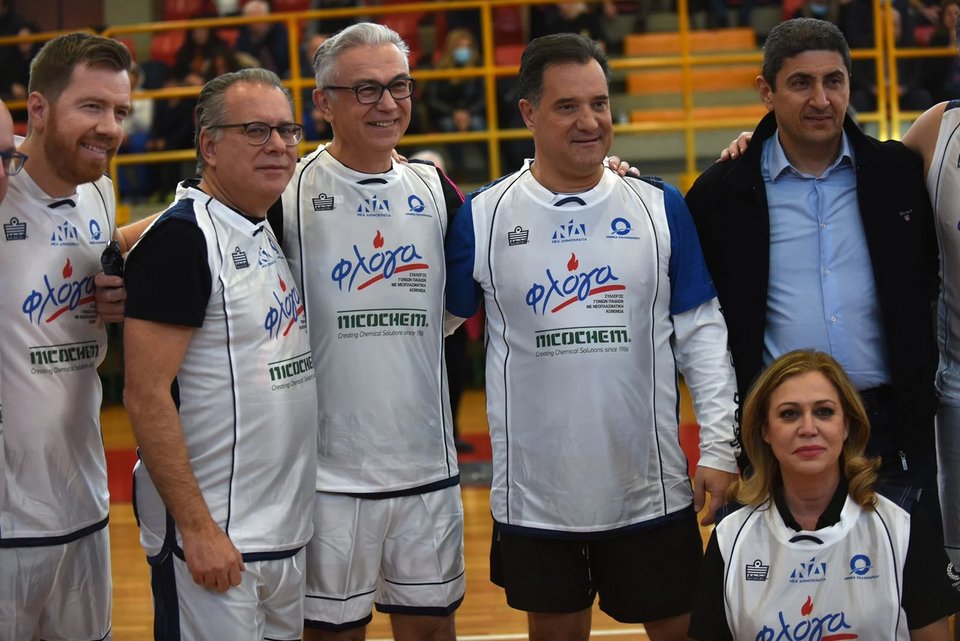 Ο Άδωνις Γεωργιάδης, ο Γιώργος Κουμουτσάκος, ο Θόδωρος Ρουσόπουλος, ο Δημήτρης Καιρίδης, η Άρια Αγάτσα, ο Φώτης Καρύδας έπαιξαν απέναντι σε παλαίμαχους μπασκετμπολίστες. Την εκδήλωση διοργάνωσε η ΔΗΜΤΟ και η ΟΝΝΕΔ Χαλανδρίου και τα έσοδα θα δοθούν στο φιλανθρωπικό σωματείο «Η Φλόγα» για παιδιά με καρκίνο.