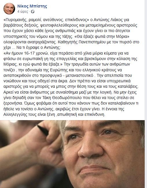 «Πυρομανής, ραμολί, ανεύθυνος, επικίνδυνος» ο Αντώνης Λιάκος για βαρβάτους δεξιούς, ψευτοφιλελεύθερους και μεταμελημένους αριστερούς που έχουν χάσει κάθε ίχνος ανθρωπιάς και έχουν γίνει οι πιο άτεγκτοι υποστηρικτές του νόμου και της τάξης. «Θα έβαζε φωτιά στην Μόρια» ολοφύρονται ανατριχιάζοντας. Καθηγητής Πανεπιστημίου με τον πυρσό στο χέρι ... Να τι έγραψε ο Αντώνης: «Αν ήμουν 16-17 χρονώ, είχα περάσει από χίλια μύρια κύματα για να φτάσω σε ευρωπαϊκή γη της επαγγελίας και βρισκόμουν στην κόλαση της Μόριας, κι εγώ φωτιά θα έβαζα.» Την τραγωδία αυτών των ανθρώπων τονίζει , την αδυναμία της Ευρώπης και του ελληνικού κράτους να ανταποκριθούν στο προσφυγικό - μεταναστευτικό . Την απελπισία που νοιώθουν και τους οδηγεί στα άκρα. Δεν πρέπει να είσαι υποχρεωτικά αριστερός για να μπορείς να μπεις στην θέση τους και να τους καταλάβεις. Αρκεί να είσαι άνθρωπος με συναίσθημα μαζί με την λογική. Να μην έχεις γίνει δηλαδή σαν τον Τάκη Θεοδωρόπουλο που θέλει να τους στείλει σε ξερονήσια. Όμως φοβάμαι ότι αυτοί που κάνουν πως δεν καταλαβαίνουν τι ήθελε να τονίσει ο Αντώνης, ακριβώς έτσι έχουν γίνει. Η έννοια της Αλληλεγγύης τους είναι ξένη, απωθητική και επικίνδυνη.