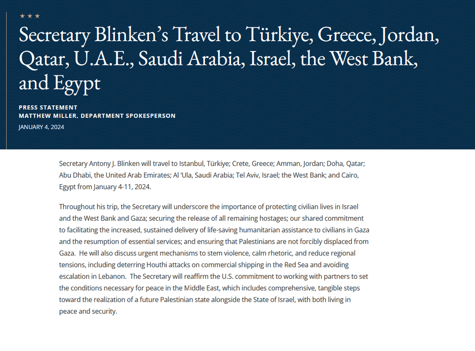Ο κορυφαίος διπλωμάτης των ΗΠΑ θα αναχωρήσει την Πέμπτη, όπως ανακοίνωσε ο Μίλερ, για μία εβδομάδα διπλωματικών επαφών σχετικά με τον πόλεμο του Ισραήλ στη Γάζα. Θα επισκεφθεί το Ισραήλ και τη Δυτική Όχθη, την Ελλάδα, καθώς και την Τουρκία, την Ιορδανία, το Κατάρ, τα Ηνωμένα Αραβικά Εμιράτα, τη Σαουδική Αραβία και την Αίγυπτο, δήλωσε στους δημοσιογράφους ο εκπρόσωπος του Στέιτ Ντιπάρτμεντ.