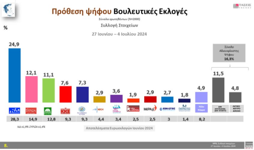 Τις τάσεις Ιουλίου δημοσίευσε η MRB. Πρόκειται για την πρώτη μέτρηση μετά τις ευρωεκλογές του Ιουνίου 2024.