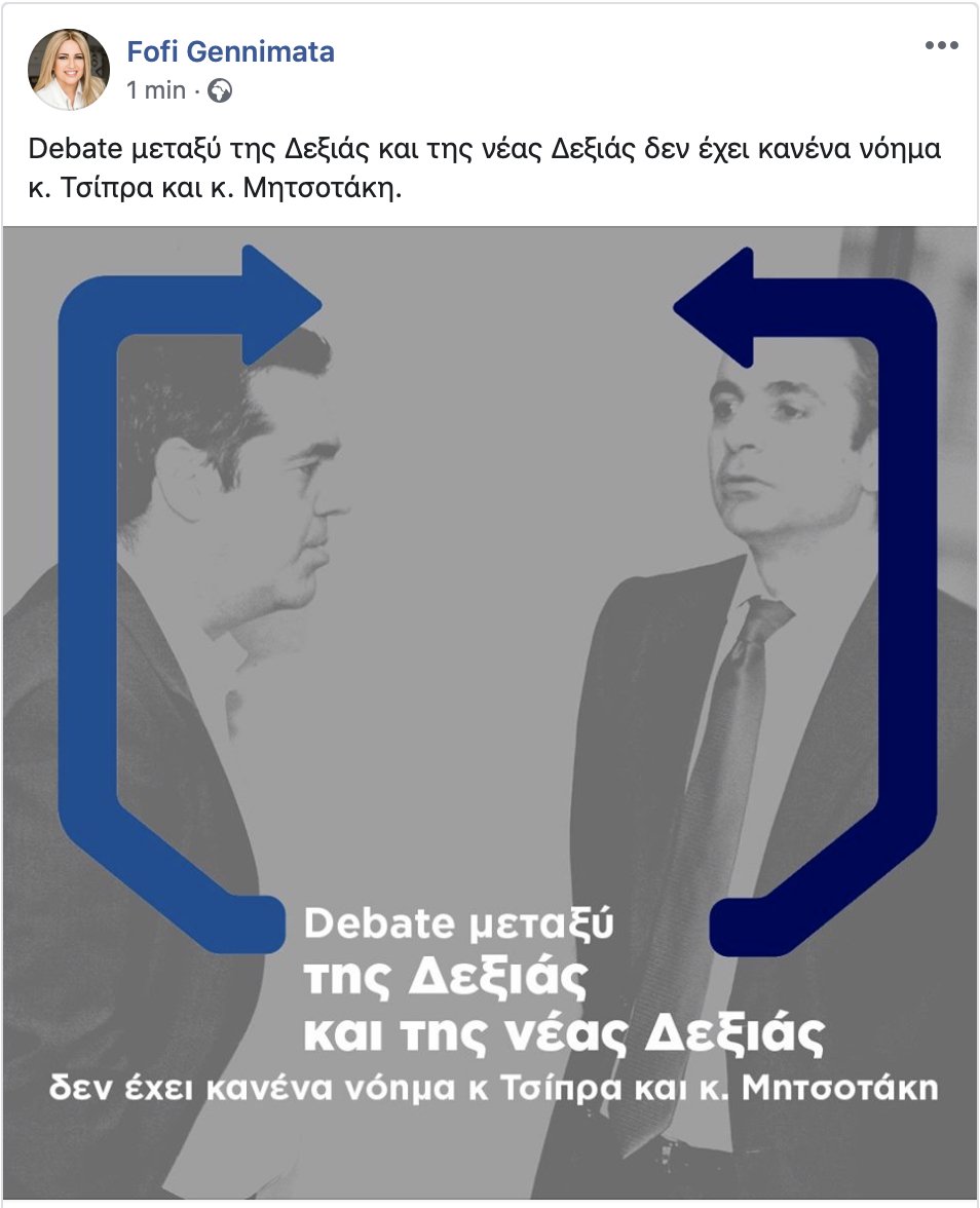 Θέση για το debate πήρε και η Φώφη Γεννηματά. Η πρόεδρος του Κινήματος Αλλαγής με ανάρτησή της στα social media σημείωσε: «Debate μεταξύ της Δεξιάς και της νέας Δεξιάς δεν έχει κανένα νόημα κ. Τσίπρα και κ. Μητσοτάκη».