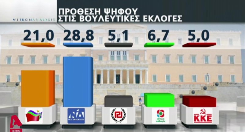 Οπως προκύπτει από την δημοσκόπηση της Metron Analysis η ΝΔ προηγείται στις ευρωεκλογές με διαφορά 7,3% συγκεντρώνοντας 25,2% έναντι 19,9% του ΣΥΡΙΖΑ. Ως προς την πρόθεση ψήφου στις εθνικές εκλογές, η ΝΔ ανεβάζει την διαφορά στις 7,8 ποσοστιαίες μονάδες, καθώς προηγείται με 28,8% έναντι 21% του ΣΥΡΙΖΑ.