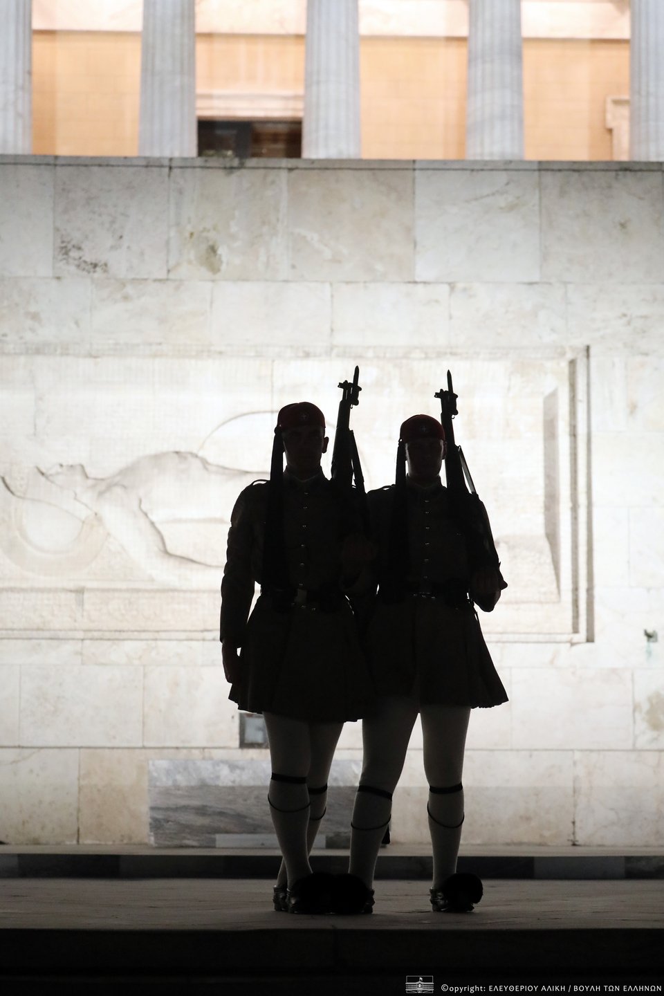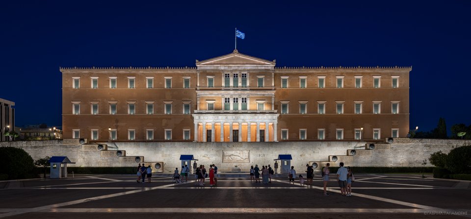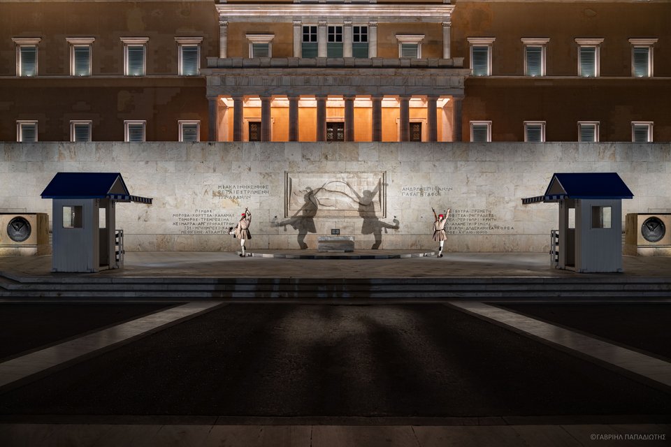 Από τη δύση του ηλίου και μετά ο φωτισμός της Βουλής και του Μνημείου του Αγνώστου Στρατιώτη εξελίσσεται ήπια και σταδιακά καθώς νυχτώνει.