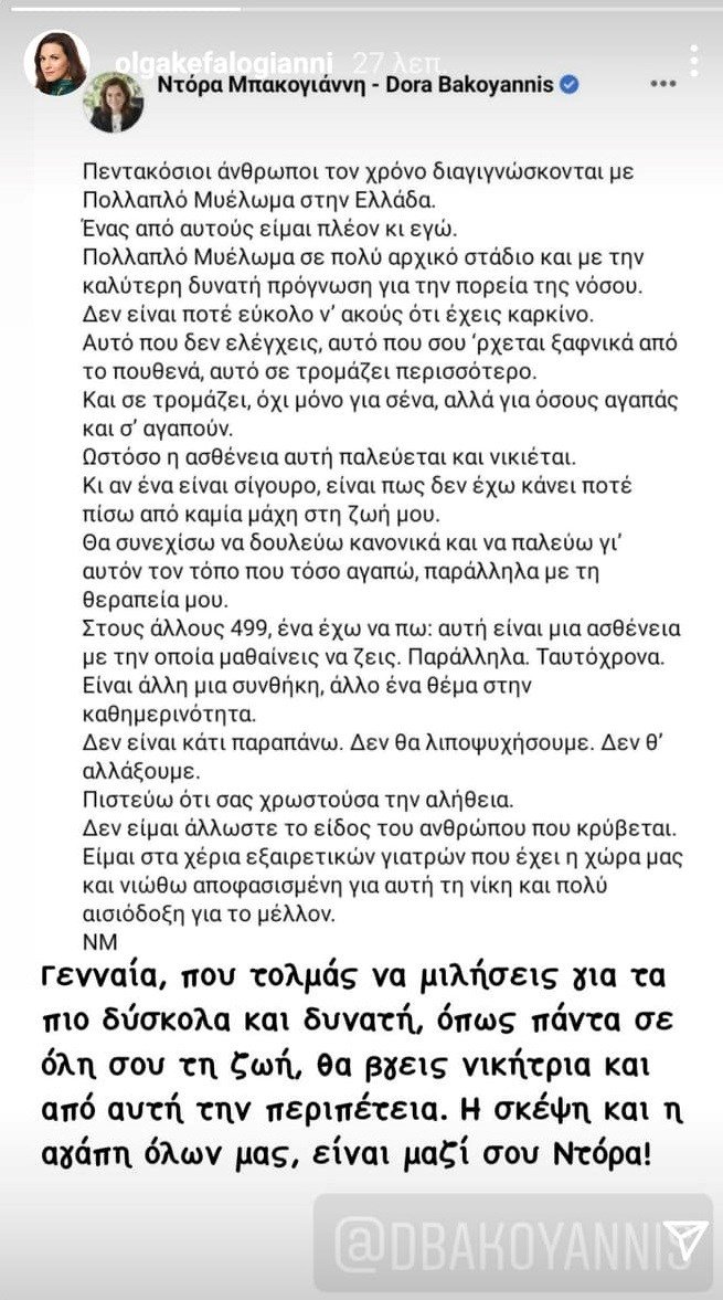 «Πεντακόσιοι άνθρωποι τον χρόνο διαγιγνώσκονται με Πολλαπλό Μυέλωμα στην Ελλάδα. Ένας από αυτούς είμαι πλέον κι εγώ. Πολλαπλό Μυέλωμα σε πολύ αρχικό στάδιο και με την καλύτερη δυνατή πρόγνωση για την πορεία της νόσου. Δεν είναι ποτέ εύκολο ν’ ακούς ότι έχεις καρκίνο. Αυτό που δεν ελέγχεις, αυτό που σου 'ρχεται ξαφνικά από το πουθενά, αυτό σε τρομάζει περισσότερο. Και σε τρομάζει, όχι μόνο για σένα, αλλά για όσους αγαπάς και σ’ αγαπούν. Ωστόσο η ασθένεια αυτή παλεύεται και νικιέται. Κι αν ένα είναι σίγουρο, είναι πως δεν έχω κάνει ποτέ πίσω από καμία μάχη στη ζωή μου. Θα συνεχίσω να δουλεύω κανονικά και να παλεύω γι’ αυτόν τον τόπο που τόσο αγαπώ, παράλληλα με τη θεραπεία μου. Στους άλλους 499, ένα έχω να πω: αυτή είναι μια ασθένεια με την οποία μαθαίνεις να ζεις. Παράλληλα. Ταυτόχρονα. Είναι άλλη μια συνθήκη, άλλο ένα θέμα στην καθημερινότητα.Δεν είναι κάτι παραπάνω. Δεν θα λιποψυχήσουμε. Δεν θ’ αλλάξουμε. Πιστεύω ότι σας χρωστούσα την αλήθεια. Δεν είμαι άλλωστε το είδος του ανθρώπου που κρύβεται. Είμαι στα χέρια εξαιρετικών γιατρών που έχει η χώρα μας και νιώθω αποφασισμένη για αυτή τη νίκη και πολύ αισιόδοξη για το μέλλον.