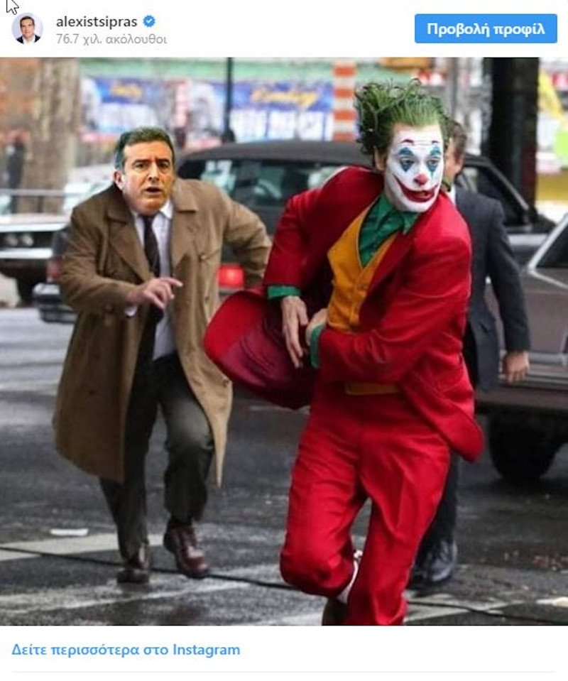 Είναι φτηνό, ενδεικτικό της αισθητικής και πολιτικής ρηχότητας του Α.Τσίπρα να συνοδεύει την ανάρτηση με δική μου φωτογραφία μονταρισμένη ως διώκτη του Τζόκερ. Τη δολοφονία χαρακτήρων, ανάμεσα σε άλλα, καταδικάζει η ταινία. Την είδε και πάλι δεν κατάλαβε ο Α.Τσίπρας.
