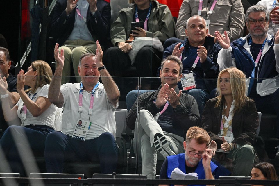 Ο πρωθυπουργός Κυριάκος Μητσοτάκης συνοδευόμενος από τη σύζυγό του Μαρέβα παρακολούθησε την προσπάθεια του Λευτέρη Πετρούνια στους προκριματικούς στους κρίκους στους Ολυμπιακούς Αγώνες 2024.