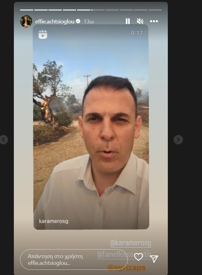 Στις πυρκαγιές της Ανατολικής Αττικής βρέθηκε ο βουλευτής του ΣΥΡΙΖΑ Γιώργος Καραμέρος και έκανε δηλώσεις μπροστά σε φλεγόμενο δέντρο. Δέχτηκε πολλά αρνητικά σχόλια γιατί, αντί να βοηθήσει την κατάσταση, χρησιμοποίησε τη φωτιά για αντιπολιτευτικό ντεκόρ.