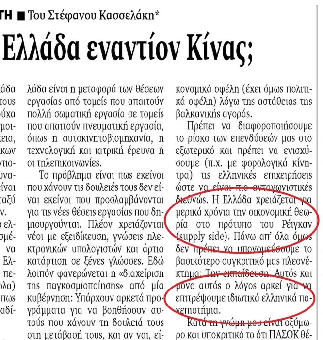 Συγκεκριμένα αναφέρει πως «ο Κασσελάκης φοιτητής ζητά να εφαρμοστεί στην Ελλάδα το δόγμα του Ρέιγκαν και να ιδρυθούν ιδιωτικά Πανεπιστήμια (7.7.2007)»