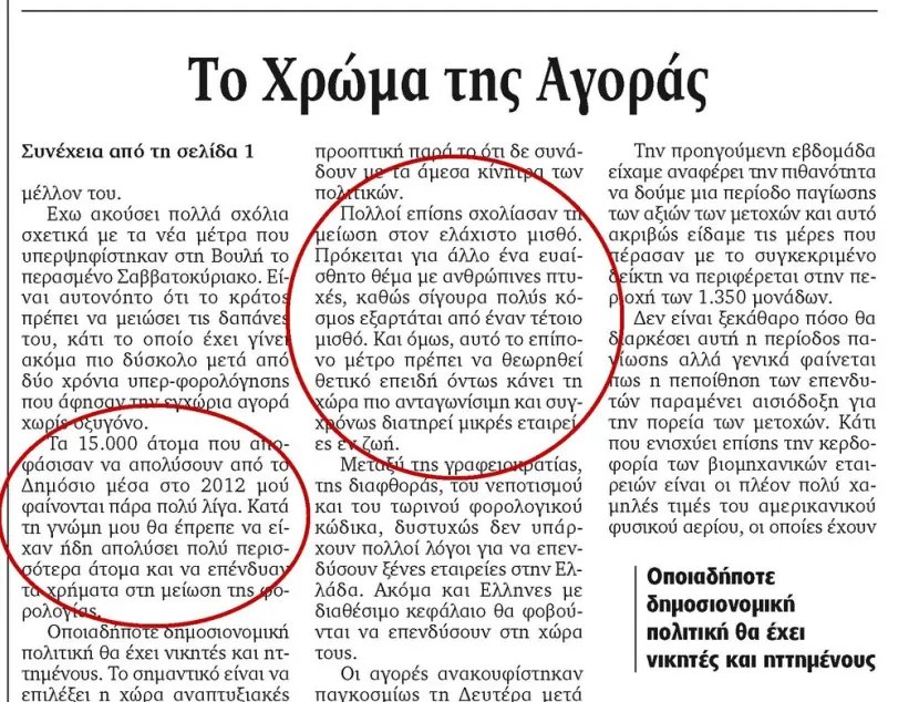 «Πολλοί επίσης σχολίασαν τη μείωση στον ελάχιστο μισθό. Πρόκειται για άλλο ένα ευαίσθητο θέμα με ανθρώπινες πτυχές, καθώς σίγουρα πολύς κόσμος εξαρτάται από έναν τέτοιο μισθό. Και όμως, αυτό το επίπονο μέτρο πρέπει να θεωρηθεί θετικό επειδή όντως κάνει τη χώρα πιο ανταγωνίσιμη και συγχρόνως διατηρεί μικρές εταιρείες εν ζωή»