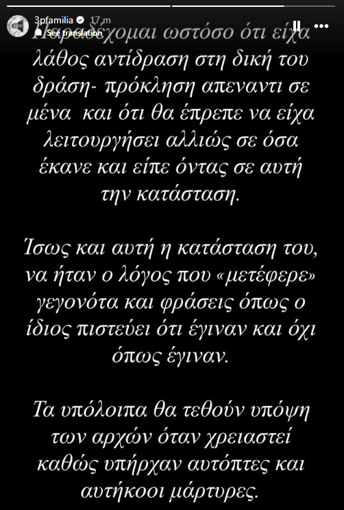 «Παραδέχομαι ωστόσο ότι είχα λάθος αντίδραση στη δική του δράση - προκληση απέναντι σε μένα και ότι θα έπρεπε να είχα λειτουργήσει αλλιώς σε όσα έκανε και είπε όντας σε αυτή την κατάσταση», γράφει ο πρώην μπασκετμπολίστας.