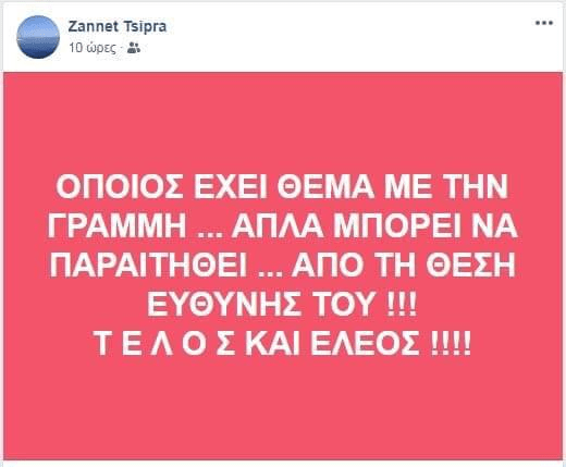 Το μέλος της Κεντρικής Επιτροπής και αδελφή του προέδρου του ΣΥΡΙΖΑ, Ζαννέτ Τσίπρα, κάλεσε όποιον δεν συμφωνεί με τη γραμμή του κόμματος να παραιτηθεί από τη θέση ευθύνης που κατέχει. ««ΟΠΟΙΟΣ ΕΧΕΙ ΘΕΜΑ ΜΕ ΤΗΝ ΓΡΑΜΜΗ ... ΑΠΛΑ ΜΠΟΡΕΙ ΝΑ ΠΑΡΑΙΤΗΘΕΙ ... ΑΠΟ ΤΗ ΘΕΣΗ ΕΥΘΥΝΗΣ ΤΟΥ !!! Τ Ε Λ Ο Σ ΚΑΙ ΕΛΕΟΣ !!!!», σημείωσε η Ζαννέτ Τσίπρα.