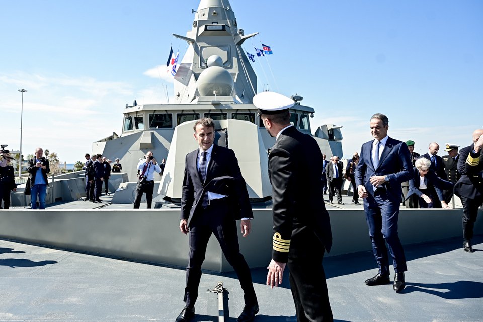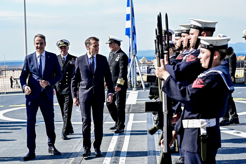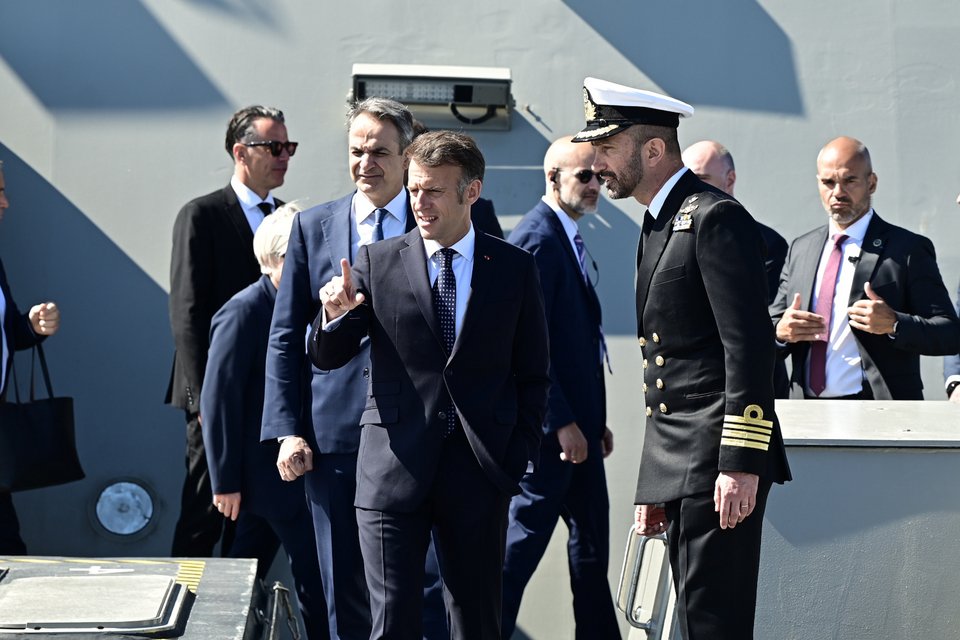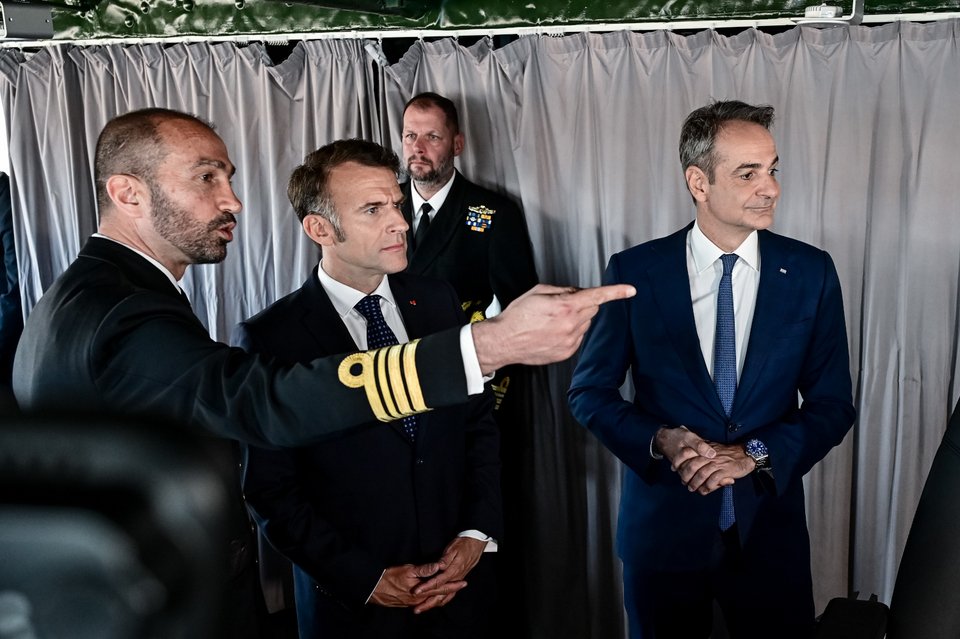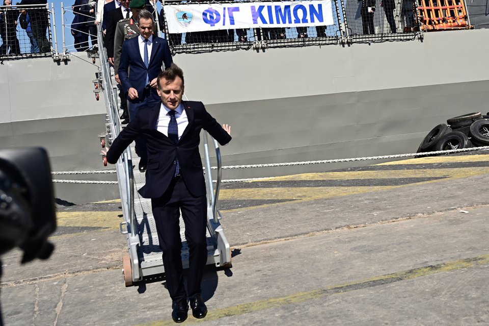 Σήμερα, Σάββατο 25/4, το πρόγραμμα του Εμανουέλ Μακρόν ξεκίνησε με επίσκεψη στη φρεγάτα «Κίμων», μαζί με τον Κυριάκο Μητσοτάκη.