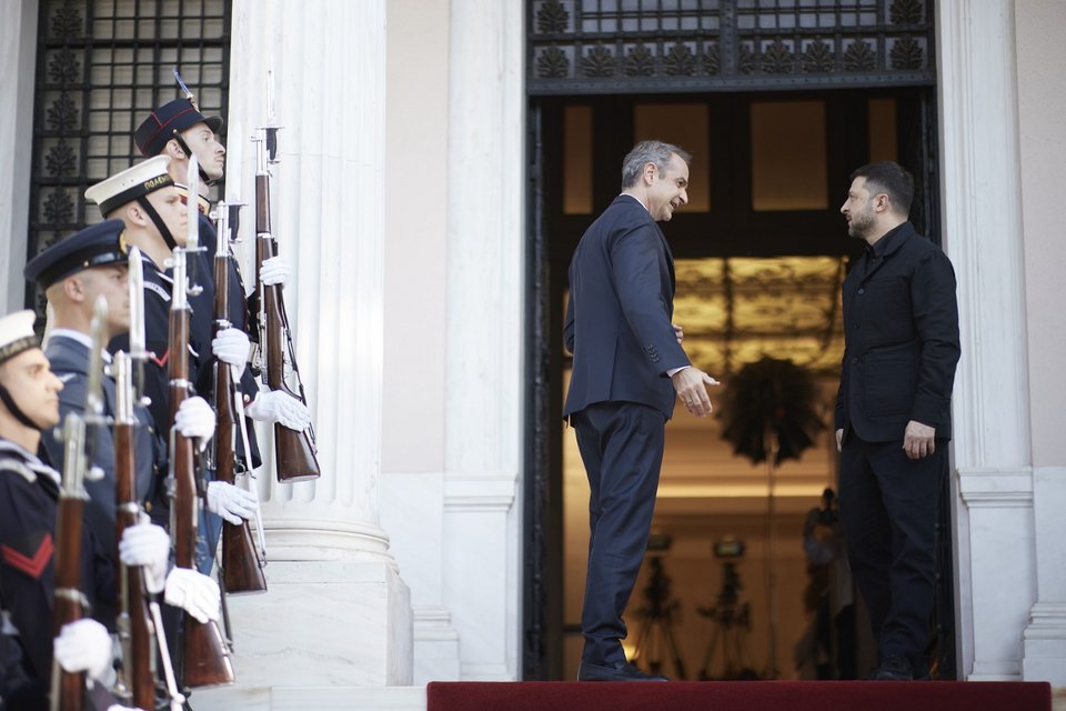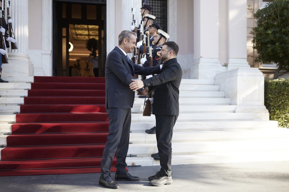 Ο πρωθυπουργός Κυριάκος Μητσοτάκης υποδέχθηκε, νωρίς το μεσημέρι στο Μέγαρο Μαξίμου, τον Βολοντίμιρ Ζελένσκι.