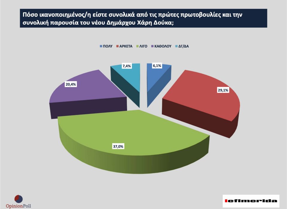 Πολύ και αρκετά ικανοποιημένοι από το συνολικό έργο του δημάρχου της Αθήνας δηλώνουν οι πολίτες σε ποσοστό 35%, ενώ η αντίστοιχη επίδοση για τον δήμαρχο Θεσσαλονίκης φτάνει το 52%.