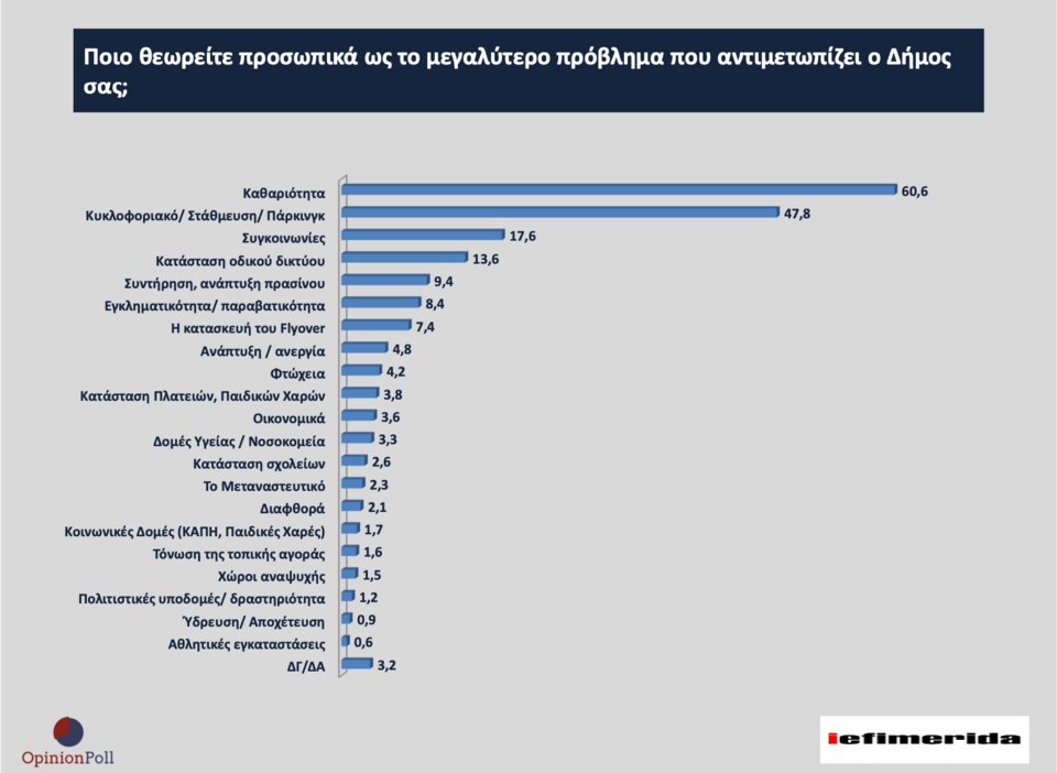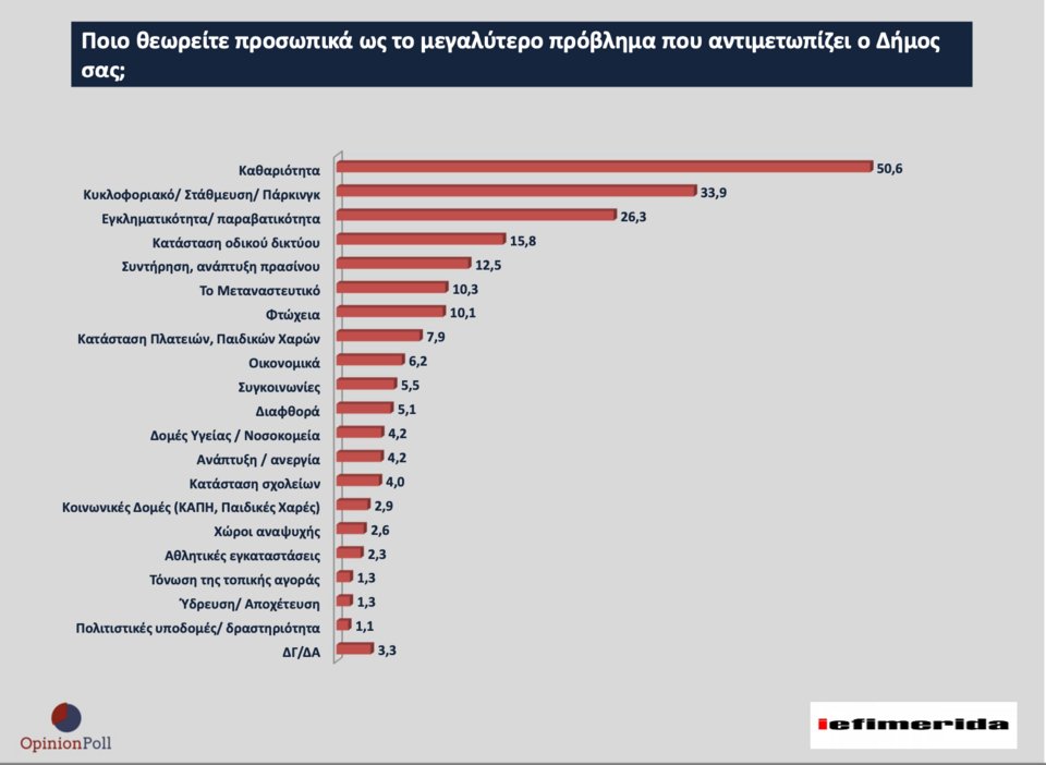 Στον Δήμο Αθηναίων ως βασικά προβλήματα ιεραρχούνται η καθαριότητα με 50,6%, το κυκλοφοριακό/στάθμευση με 33,9%, η εγκληματικότητα/παραβατικότητα με 26,3%, η κατάσταση οδικού δικτύου με 15,8%, η συντήρηση-ανάπτυξη πρασίνου με 12,5%, το μεταναστευτικό με 10,3%, η φτώχεια με 10,1%, η κατάσταση των πλατειών/παιδικών χαρών με 7,9% κ.λπ.