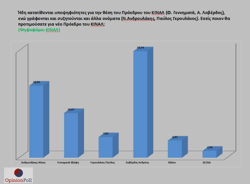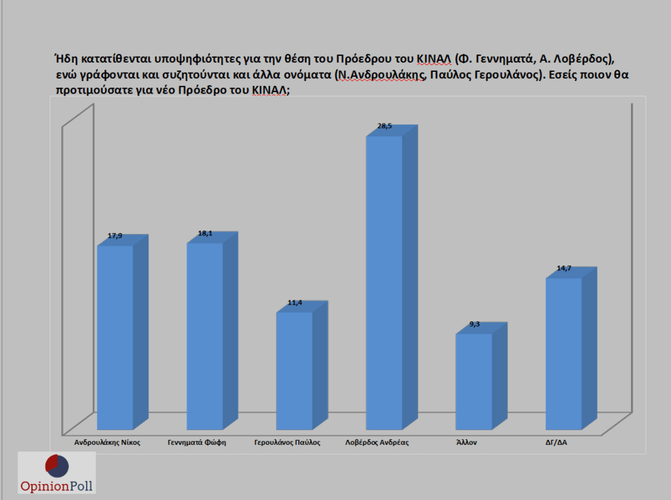 Σημειώνεται ότι ο Ανδρέας Λοβέρδος φαίνεται να προηγείται στη μάχη για την ηγεσία του Κινήματος Αλλαγής. Ο κ. Λοβέρεδος συγκεντρώνει ποσοστό 28,5% έναντι 18,1% της Φώφης Γεννηματά και 17,9% του Παύλου Γερουλάνου.